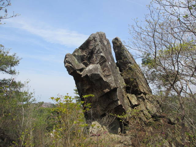 これがOさんに教えてもらった二枚岩だ。文字通り、2つの大きな岩が仲良く並んでいる。元はひとつの岩だったのがなんらかの原因で割れたのではないだろうか。断面が一致する。