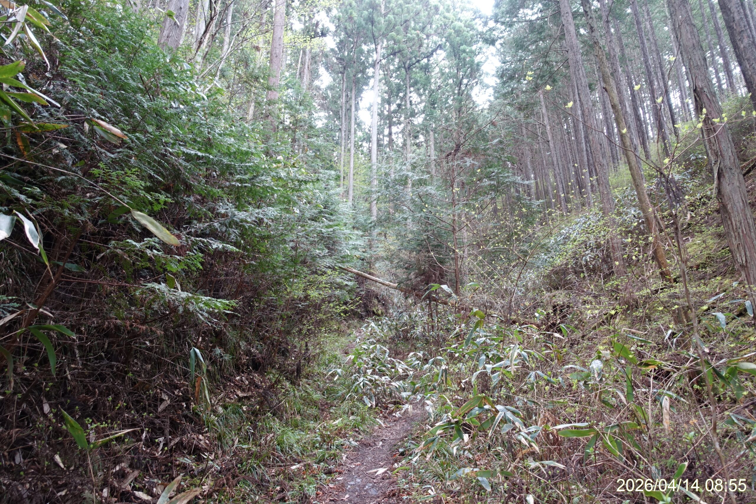 スタート地点のウツボ沢に戻るにはこの沢筋を下って林道に出、沢(如来沢)と並行する林道を3キロほど歩く。
