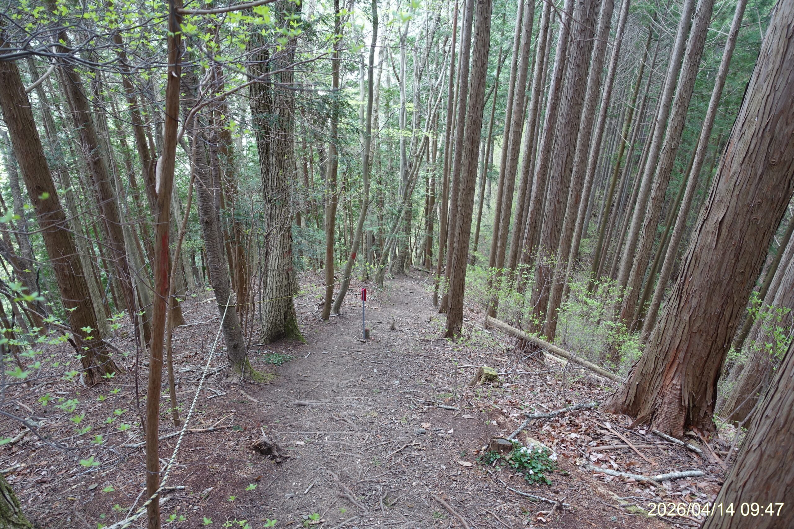 目の前に見える鬱蒼とした檜林を突き抜ける?、いやそうではなく、ここを右へ上がって行く。