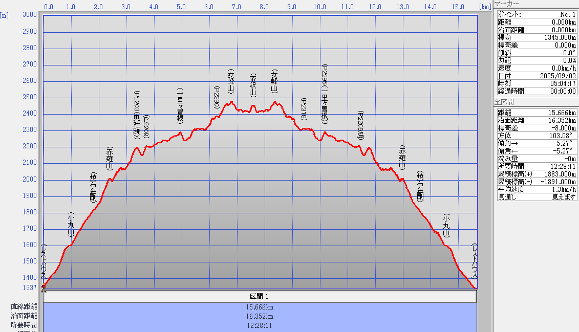 完全なピストン山行なので帝釈山を真ん中に、左右対称の断面となっている。