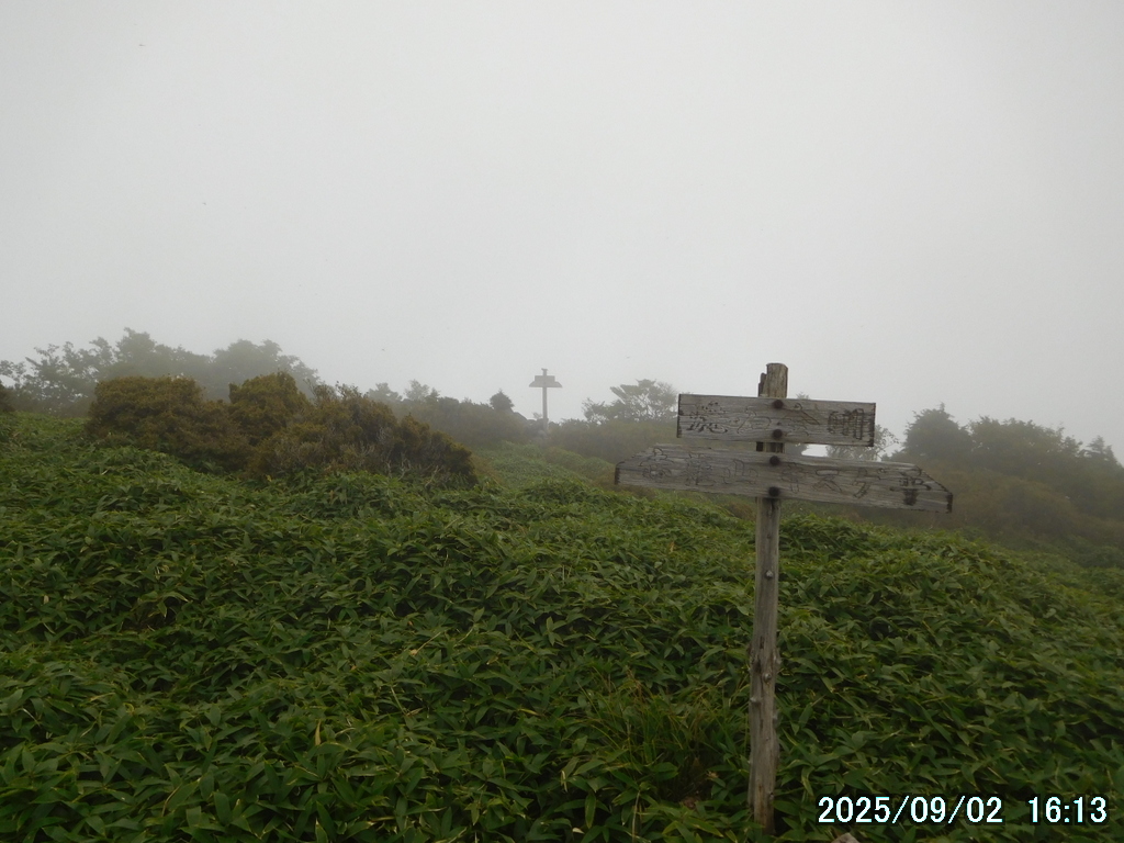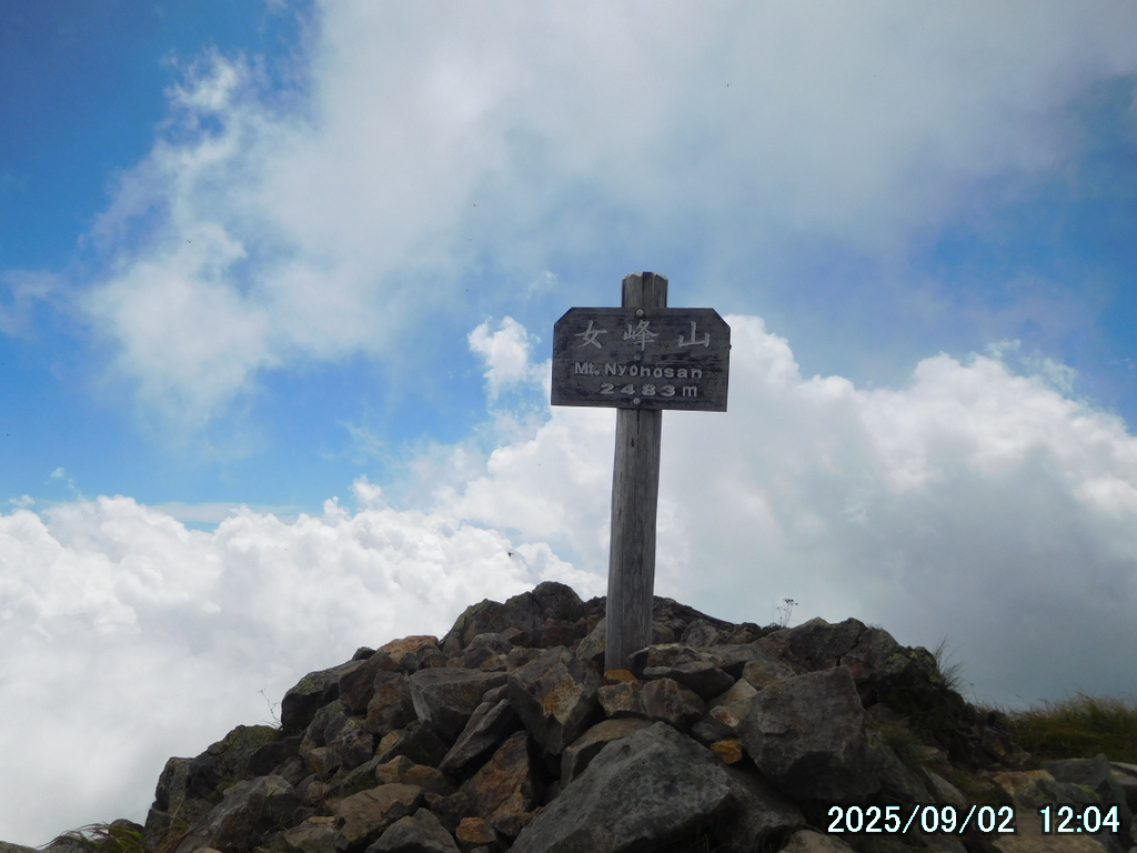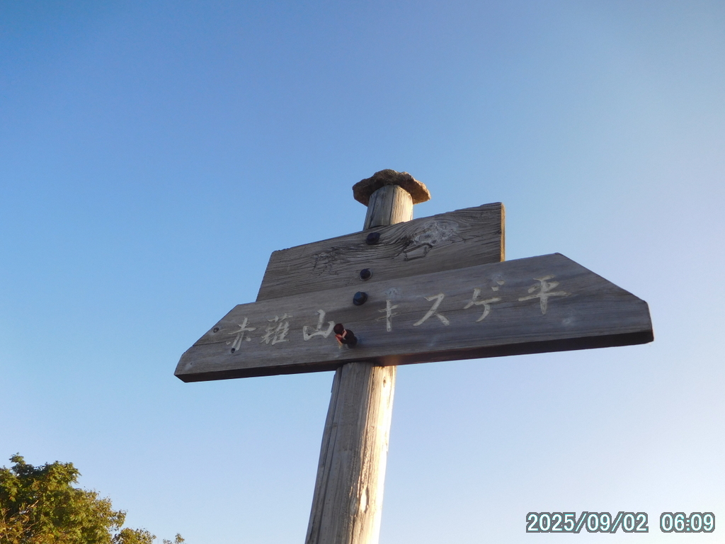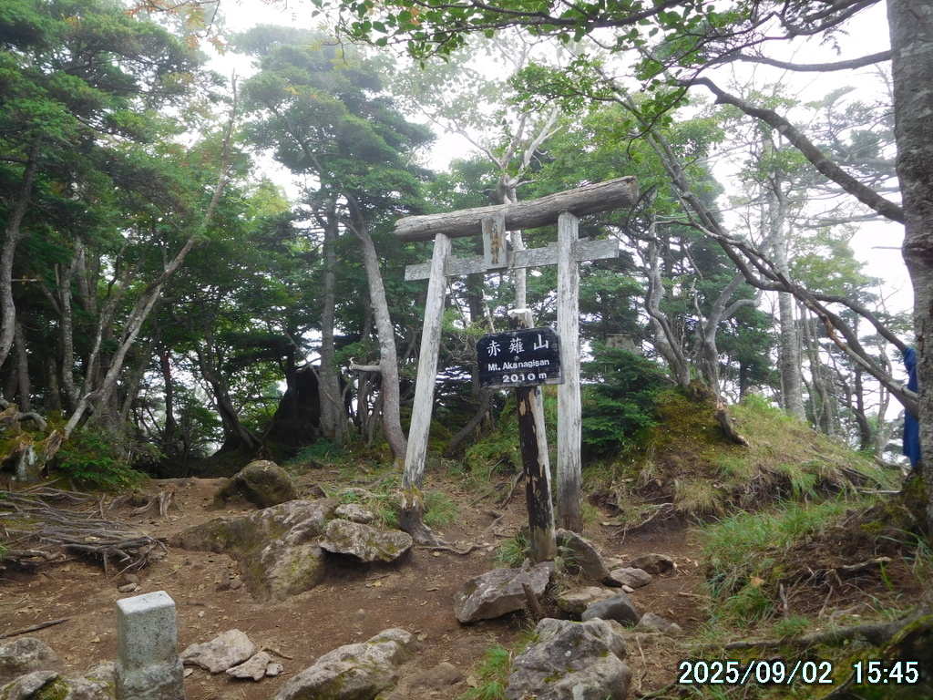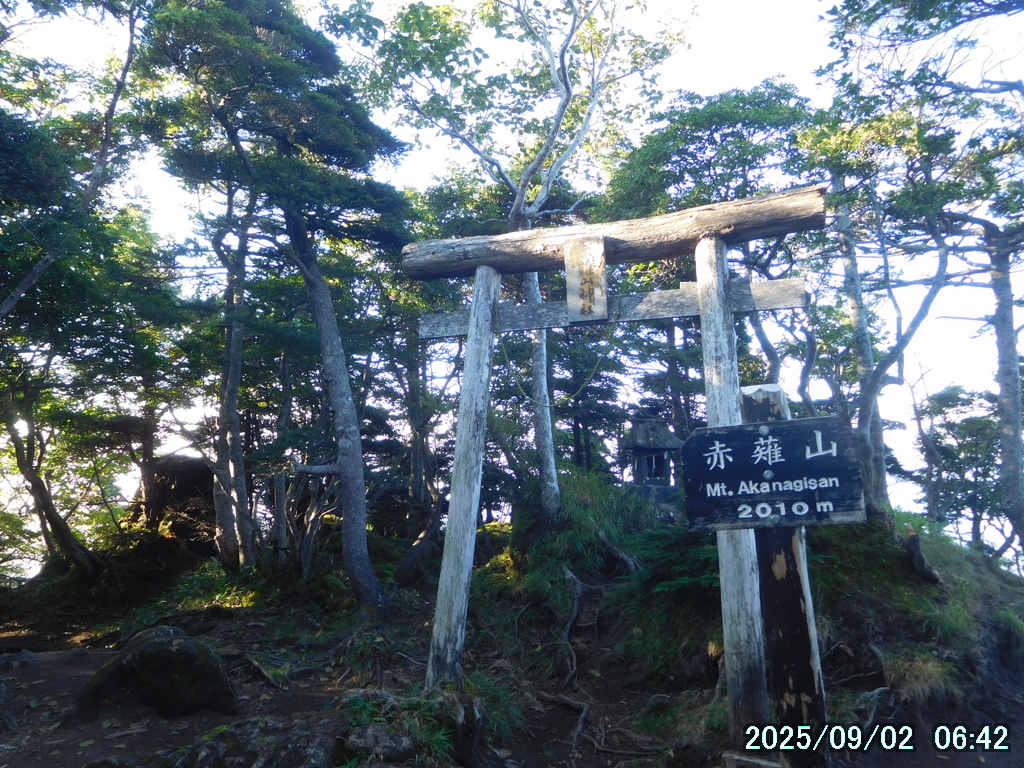 05:00 霧降高原 – 06:01 小丸山 – 07:33 赤薙山 – 08:30 赤薙奥社跡 – 09:16 一里ヶ曽根 – 10:29 三角点 – 10:36 女峰山 – 11:01 帝釈山 – 11:29 女峰山 – 11:34 三角点 – 12:30 一里ヶ曽根 – 13:07 赤薙奥社跡 – 13:45 赤薙山 – 14:37 小丸山 – 15:12 霧降高原(所要時間:10時間12分)