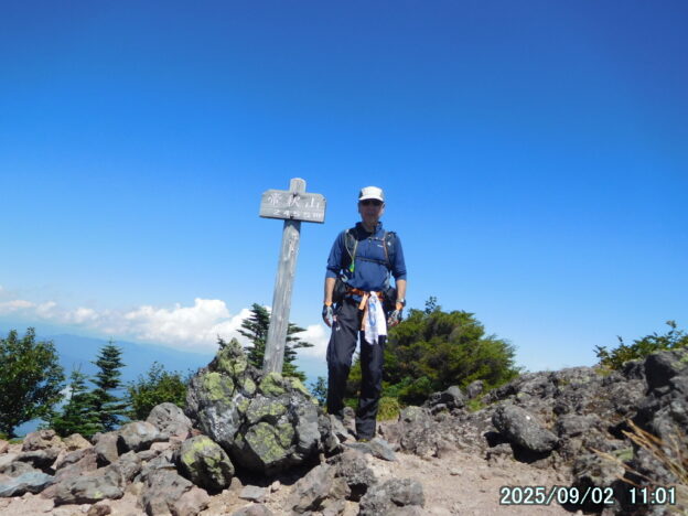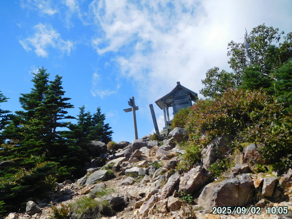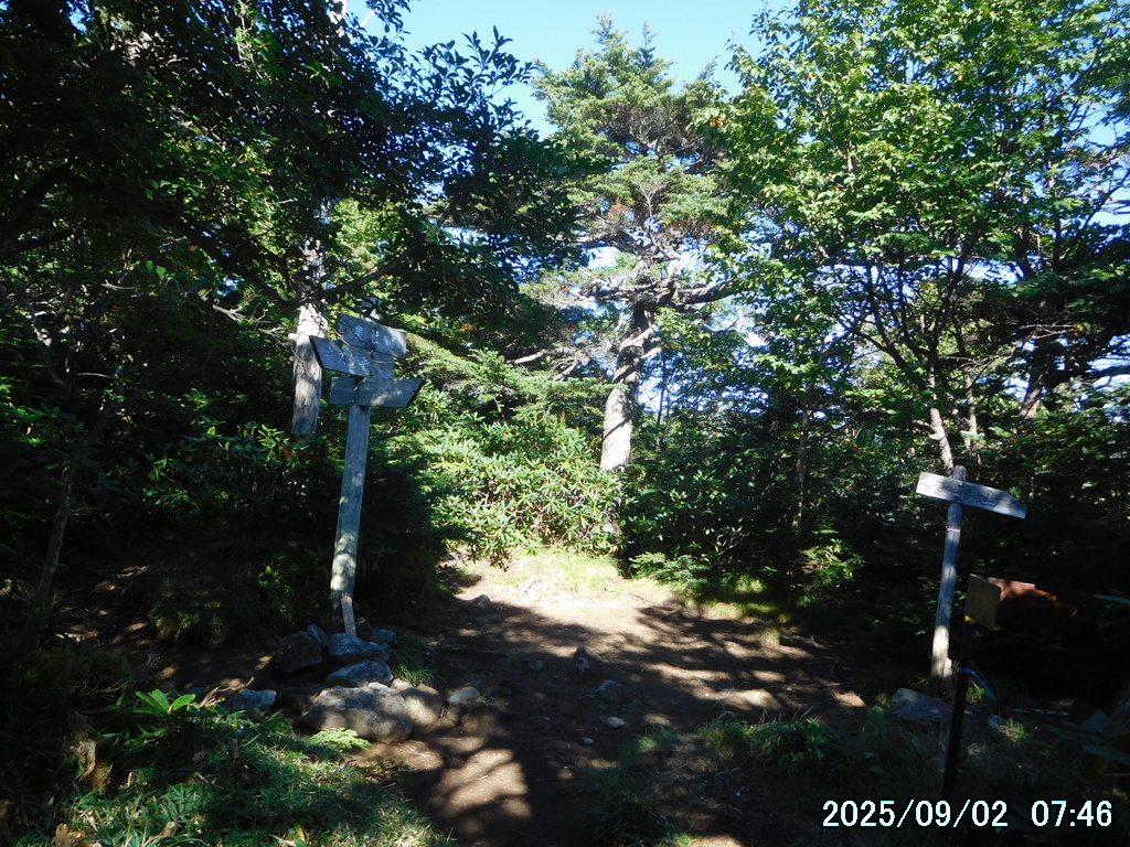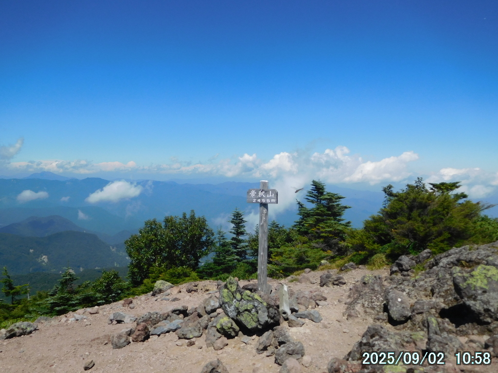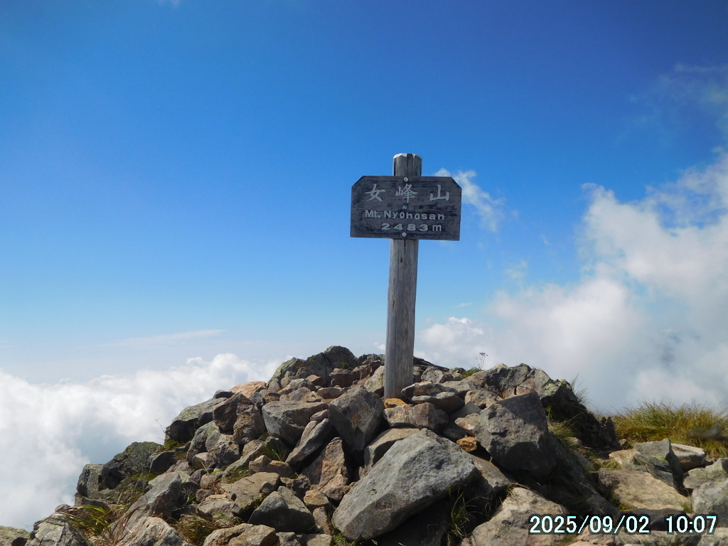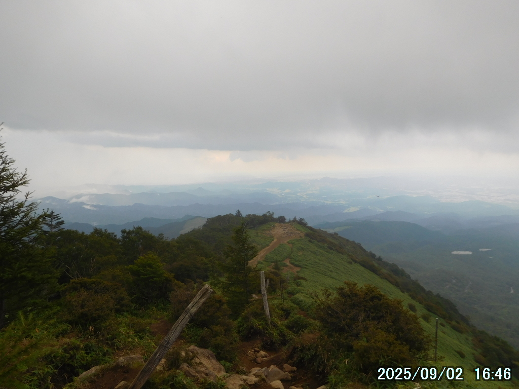 05:00 霧降高原 – 06:01 小丸山 – 07:33 赤薙山 – 08:30 赤薙奥社跡 – 09:16 一里ヶ曽根 – 10:29 三角点 – 10:36 女峰山 – 11:01 帝釈山 – 11:29 女峰山 – 11:34 三角点 – 12:30 一里ヶ曽根 – 13:07 赤薙奥社跡 – 13:45 赤薙山 – 14:37 小丸山 – 15:12 霧降高原(所要時間:10時間12分)