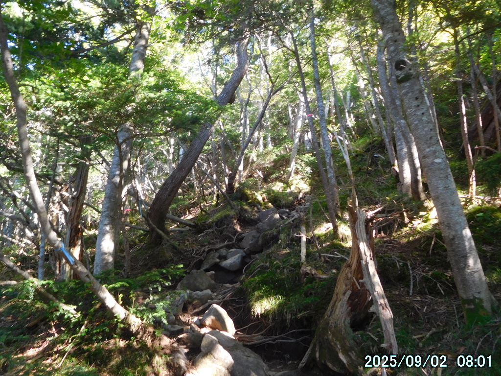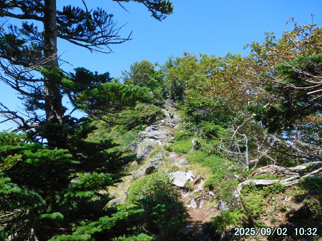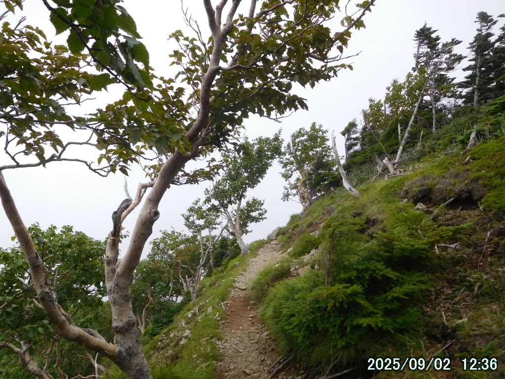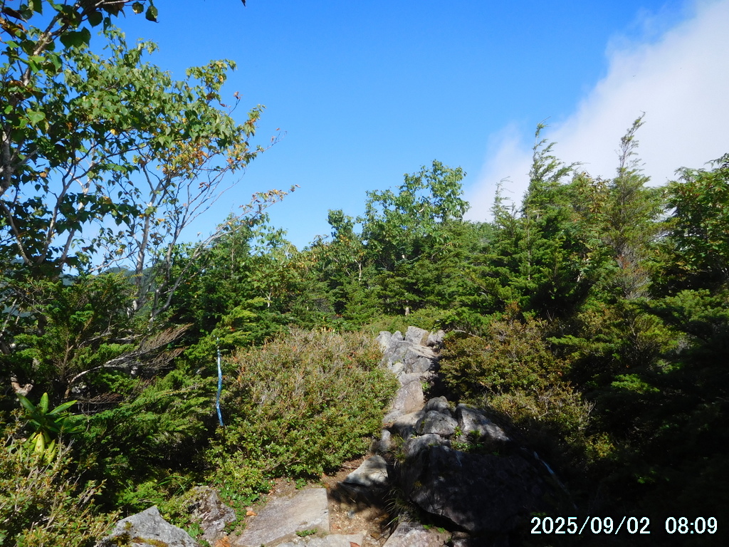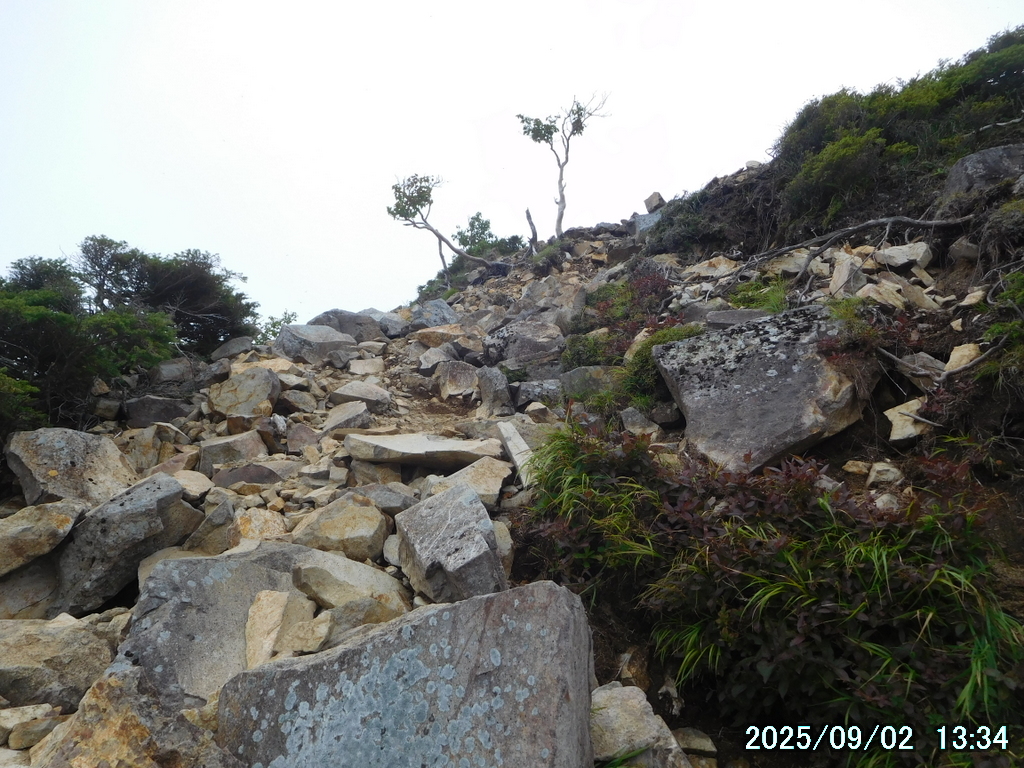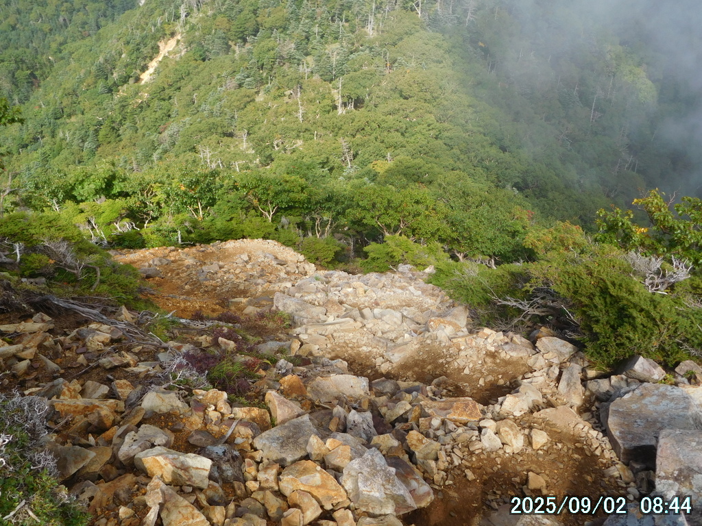 ガレ場が終わったので前を見ると、霧が立ち込めるコメツツジの林の中に、小岩が堆積したわかりやすい1本の真っ直ぐな道が見えた。