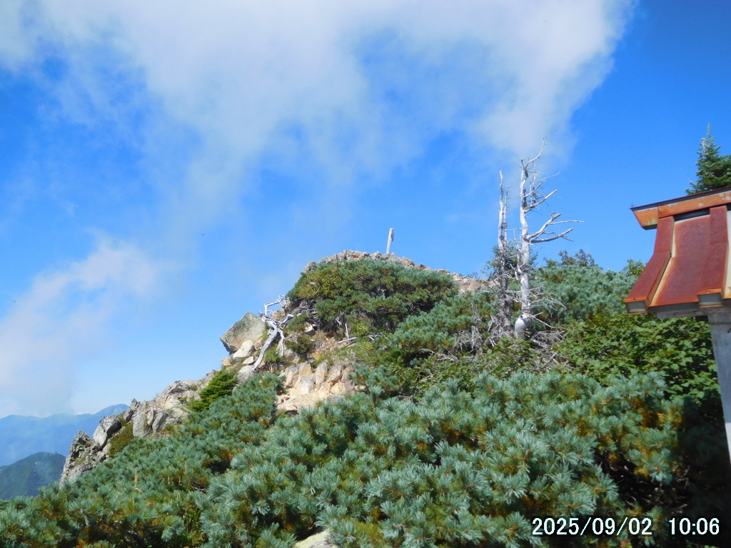 赤薙山山頂はコメツガに囲まれていて展望が得られるのはこの場所、鳥居の奥しかない。