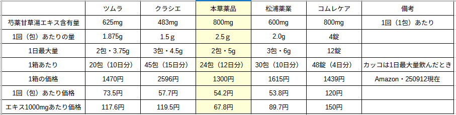 このデータから、管理人の推しは知名度の高いツムラを抑えて、本草薬品の芍薬甘草湯ということになる。