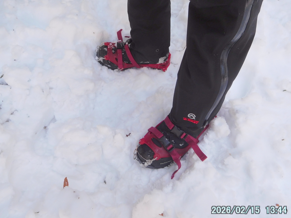 雪が締まりスノーシューが使いづらくなったので、ここでチェーンスパイクに履き替えた。