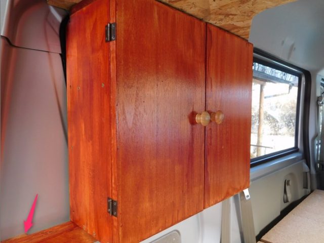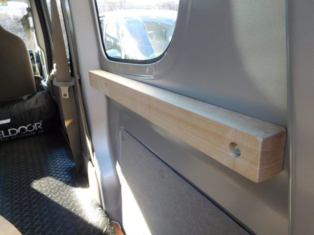 前述した難問(傾斜という問題)の解決方法だが、角材と荷室側面との間に12ミリの合板をカットして取り付け(画像矢印)、角材を荷室側に出っ張らせてみた。