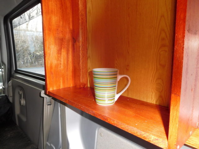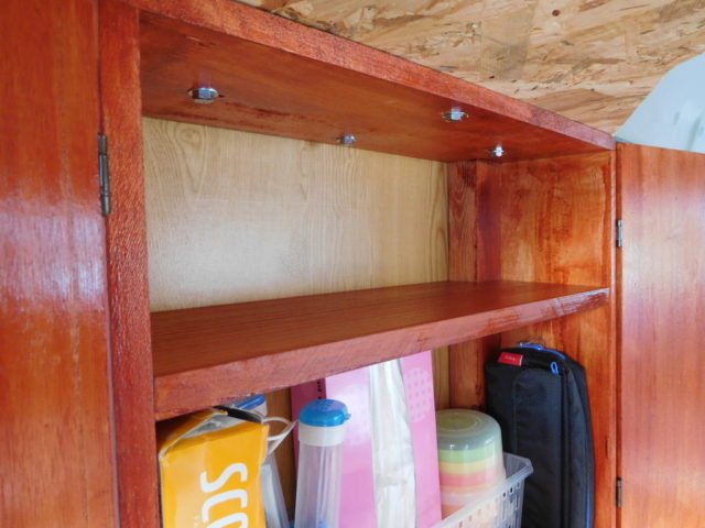 昨日紹介した備品、スノーシューやアイゼン、チェーンスパイクといった山道具の他に、カセットコンロやカセットガス、やかん、クッカー、フライパン、ホットサンドメーカー、食器といった調理道具を収納できるようになったが他の小物類、例えば歯ブラシや歯磨き、コップ、調味料や嗜好品などはベッド下収納スペースに収めると他の用具に埋もれて取り出せなくなるため、別の場所に収納し、取り出しやすいようにしたい。