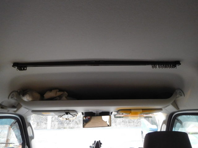このカーテンレールは伸縮式で幅120センチまで伸ばすことができるが、エブリイの天井はかまぼこ形をしているため、これ以上(72センチ)、伸ばすとレールと天井との間に大きなすき間が空いてしまう。