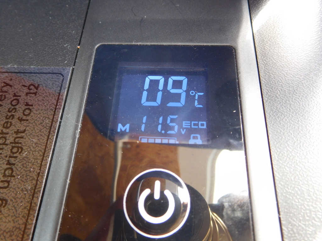 庫内の温度はプラス3度に設定しているがアイドリング程度だと稼働に必要な12ボルトを下回ってしまい冷えない(走行中ならもう少し高いのだろうが)。