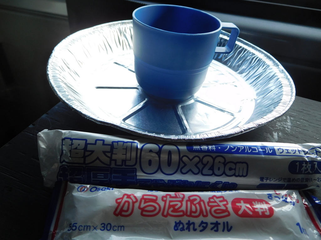 手前のぬれタオルは手拭きやふきんとして使ったり温泉に入れないときは顔を拭ったり身体の汚れを取ったり、それを水洗いして再使用と繰り返し使えるので実に便利だ。