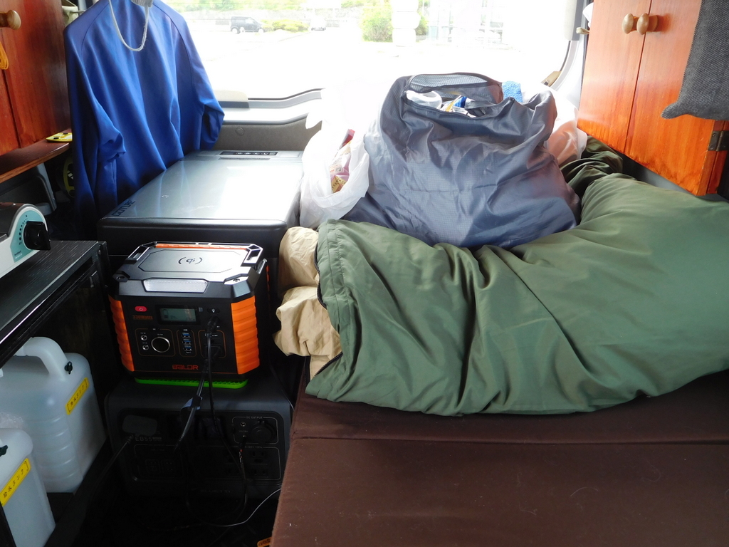 ベッドの左側に給排水システムとポータブル電源を2台、冷蔵庫、2Lのペットボトル3本を置いてある。